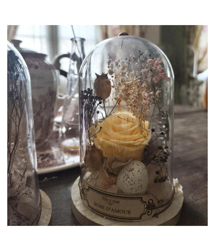 Véritable rose éternelle couleur jaune aurore trônant sur un bouquet glané de curiosité et fleurs séchées inspiré de l'amour naissant du printemps: gypsophile, nigelle, broom, plume de pintade et petit oeuf.